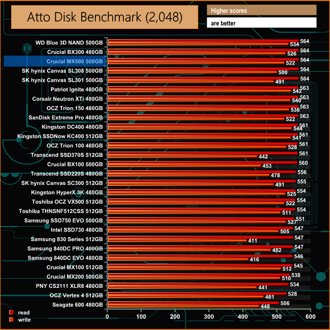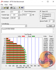 Official Sequential read/write performance figures for the 500GB drive (the same across all the drives in the range) is up to 560MB/s for reads and 510MB/s for writes. These figures we were able to confirm with the ATTO benchmark with the review drive producing a read performance of 564MB/s. When it came to writes, the drive was a little faster than the official figure, producing a score of 522MB/s.