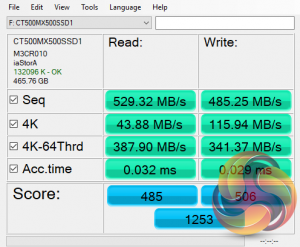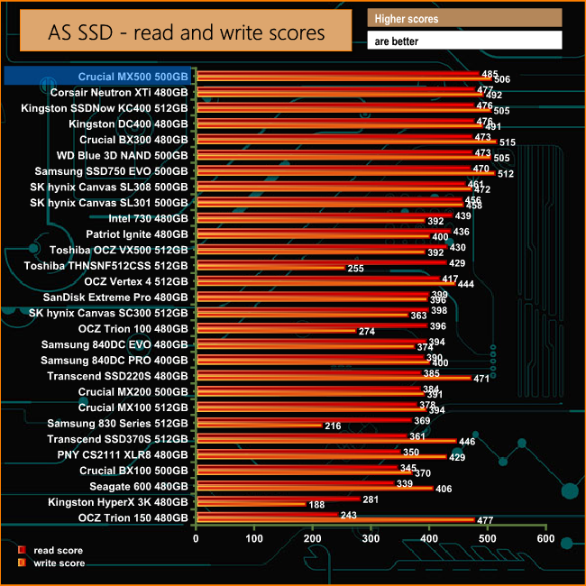 The MX500 tops the charts of the 500GB class 2.5in SSD's we've tested when it comes to the AS SSD benchmark in terms of read performance. Although the write performance, with a score of 506 is very good, Crucial's BX300 drive actually gave a slighty better write score of 515.