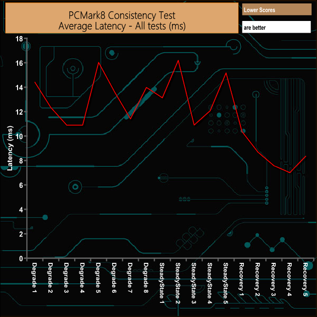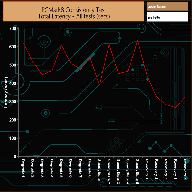 The MX500 performs reasonably well in PCMark 8's Consistency Test despite a couple of falls in performance during the Degradation stages. It starts to recover well from the ordeal but oddly the performance drops back in the last Recovery run.
