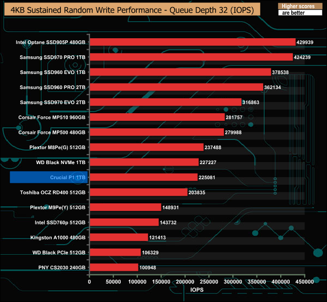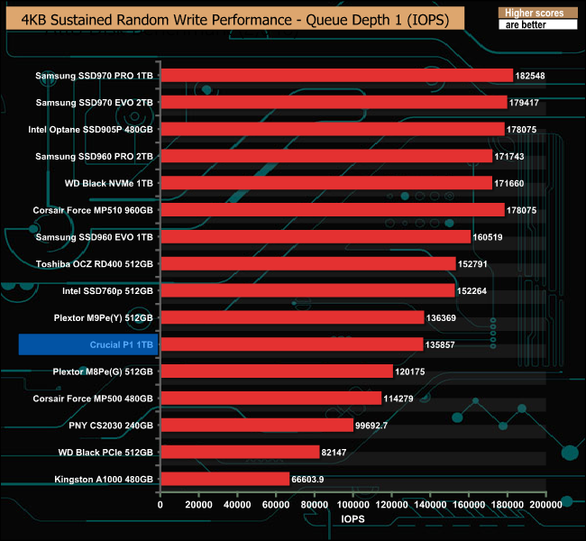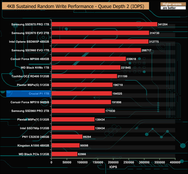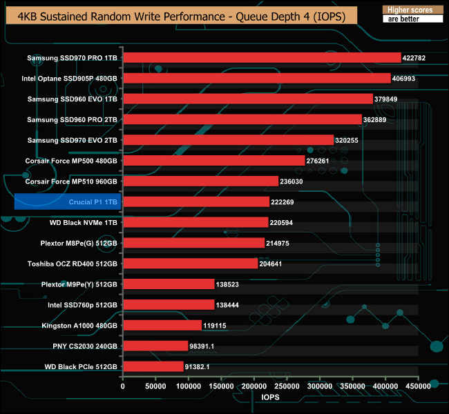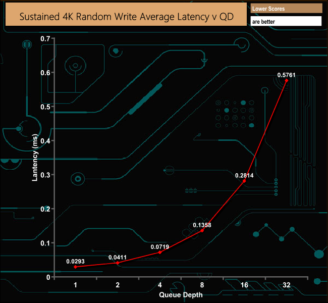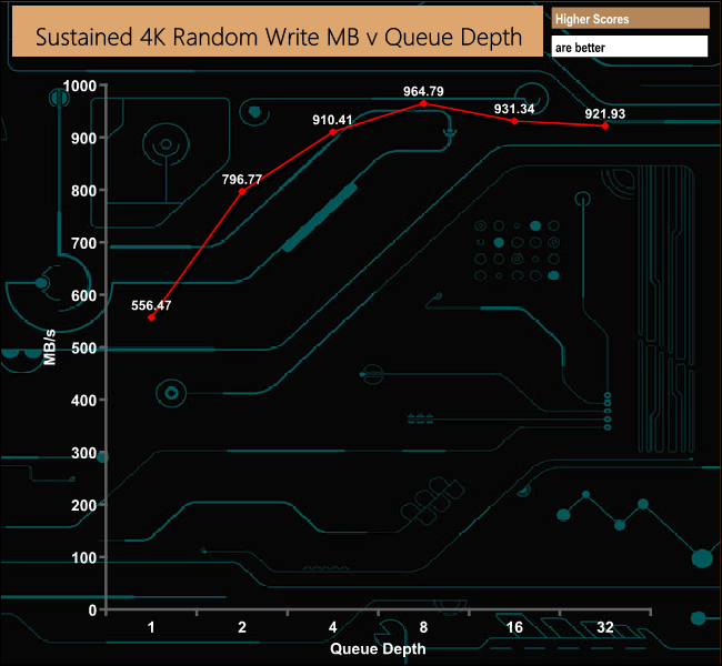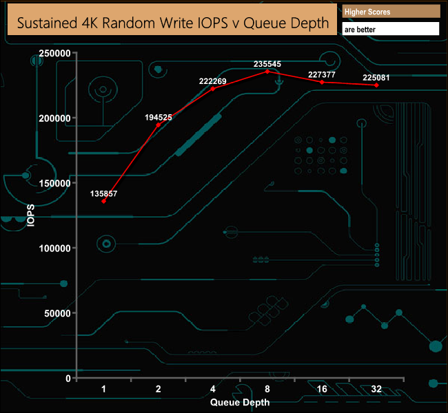 In marked contrast to the 4K random read test, the drive performed reasonably well in the 4K sustained random write tests.