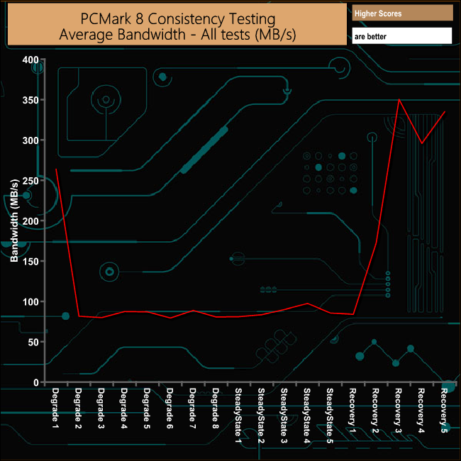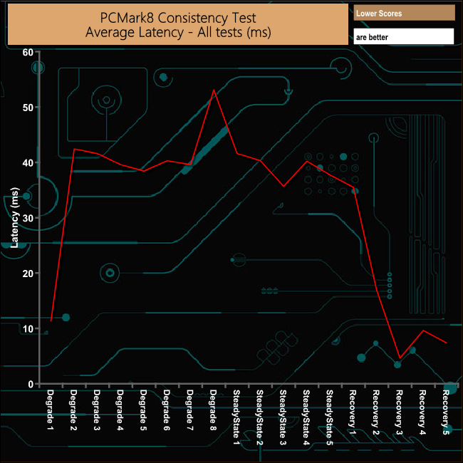 Overall the P1's performance gets hit very hard during the Degradation and Steady State runs of the PCMark 8's Consistency test as the SLC buffer gets smaller as the drive is filled with data. However, the drive's recovery from the ordeal is very good indeed – although not consistent.