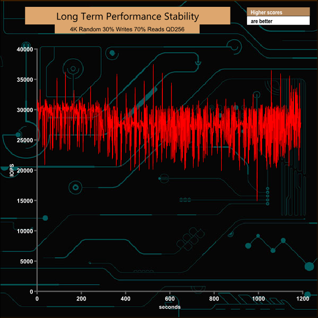 For the long term performance stability test, we set the drive up to run a 20-minute 4K random test with a 30% write, 70% read split, at a Queue Depth of 256 over the entire disk. The 1TB Crucial P1 averaged 27,832 IOPS for the test with a performance stability of 82.1% – which is superb for a drive in this class.