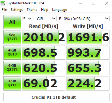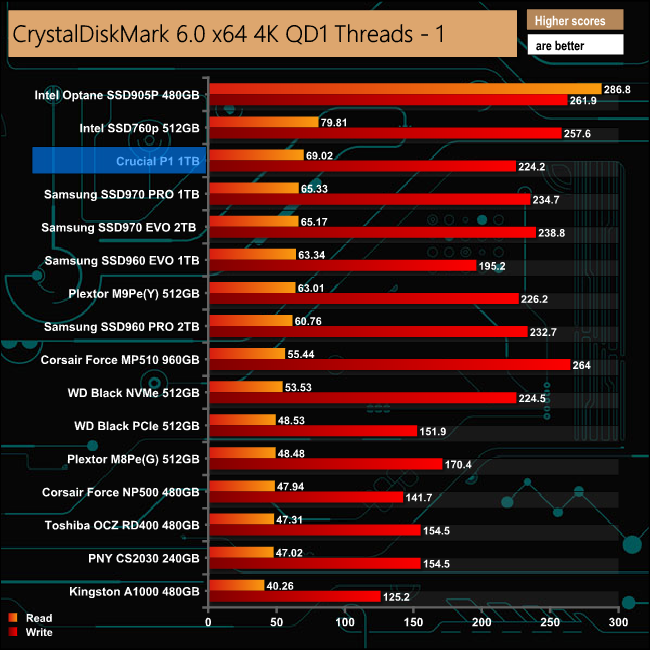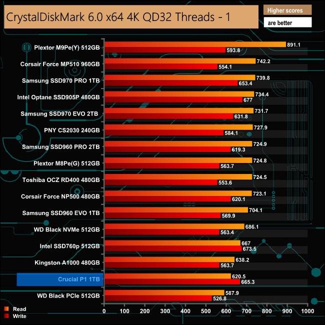 In the CrystalDiskMark benchmark, Crucial's P1 doesn't perform too well at a deep queue depth of 32 – particularly when it comes to read performance. However, when it comes to operating at a queue depth where a great deal of the everyday workloads occur, namely a QD of 1, it performs very well.