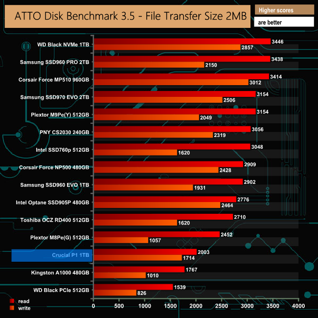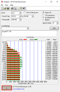 Crucial's official figures for the Sequential performance of the 1TB drive are up to 2,000MB/s for reads and up to 1,700MB/s for writes. As you can see from the ATTO benchmark results, the tested drive confirmed these figures with reads of 2,003MB/s and 1,714MB/s for writes.