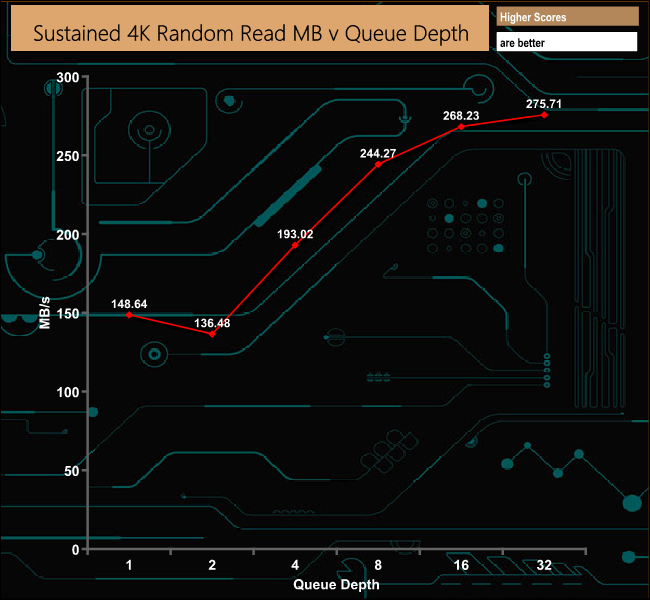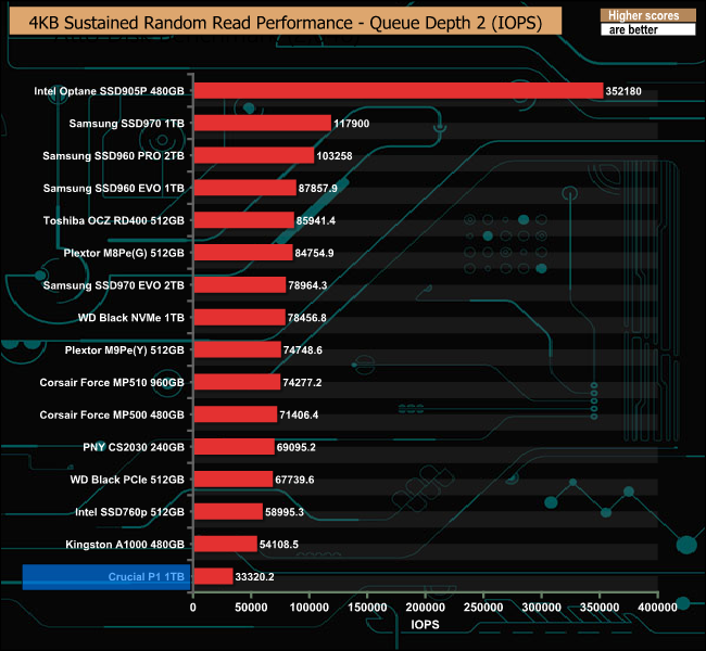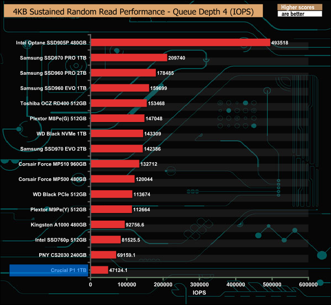 The Crucial P1 didn't perform too well in our sustained 4K random read test, sitting at the bottom of the comparison graphs in all but the QD1 test.