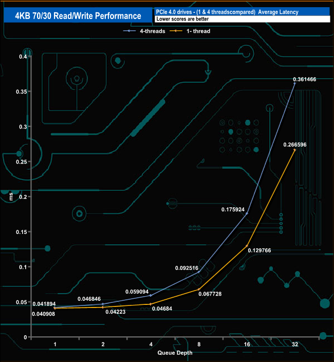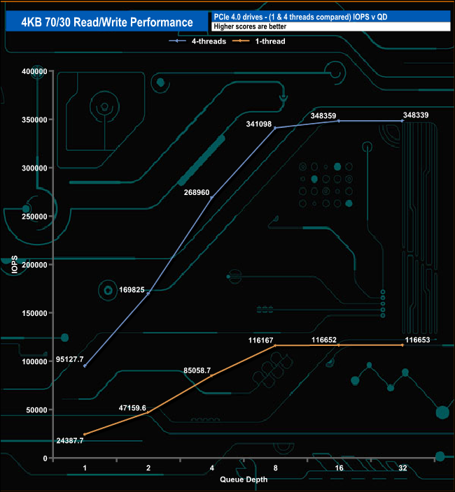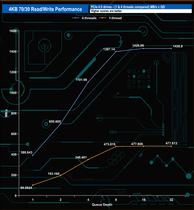 We used CrystalDiskMark 8’s custom settings to test the 4K 70/30 mixed read/write performance of the drive through a range of queue depths using a single thread and four threads.