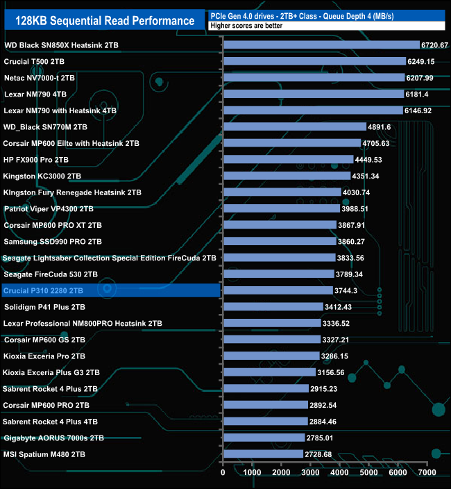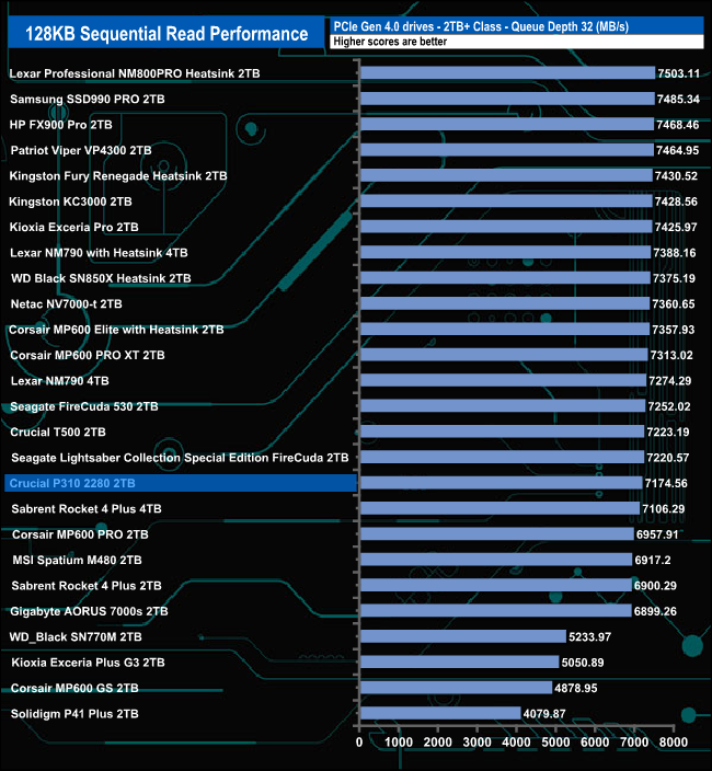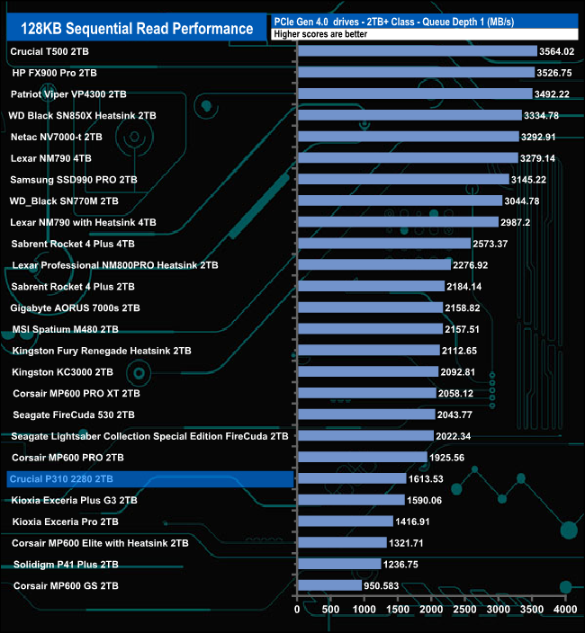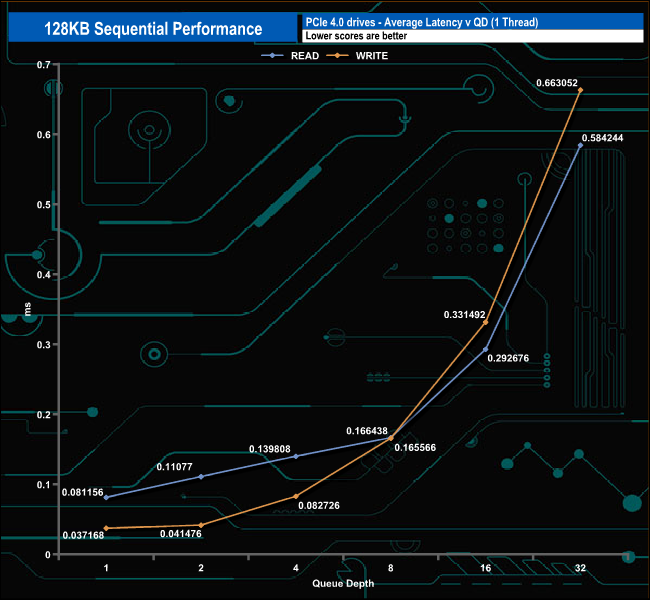 The drive sits in the bottom half of the read result chart through all the tested queue depths. Compared to the drives around it, the best performance seems to come at QD4.