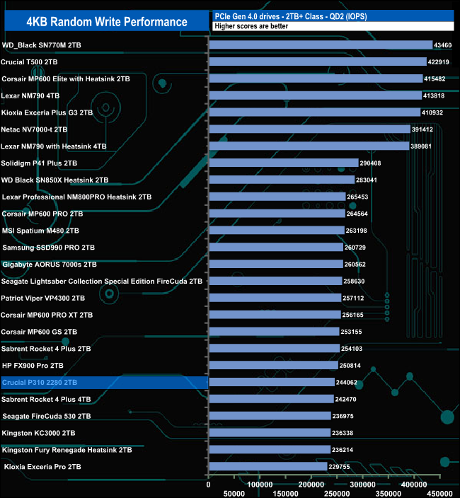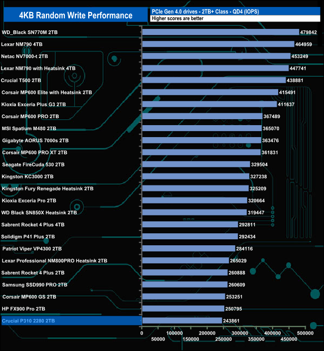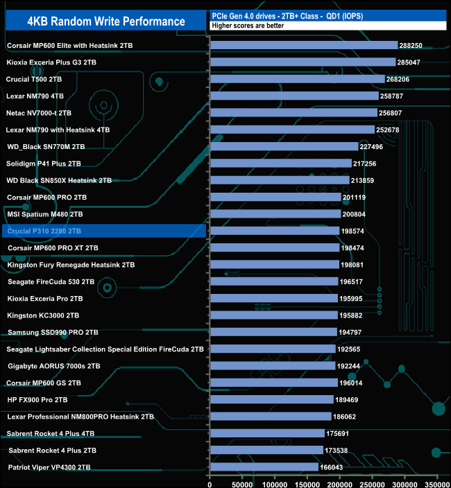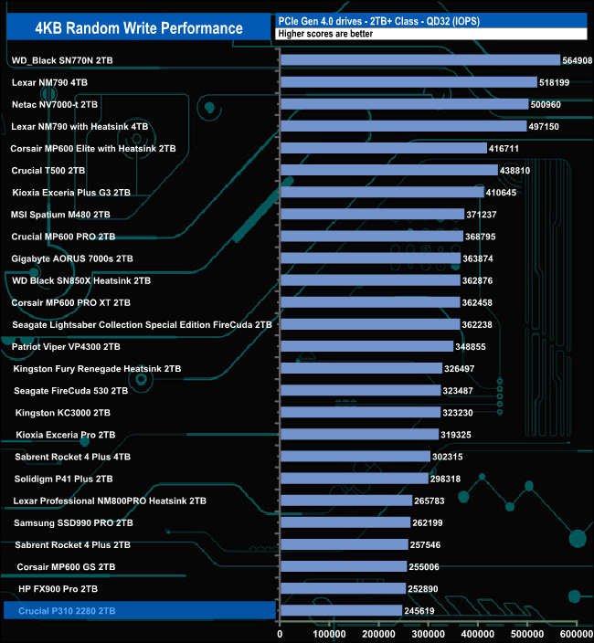 Compared to the drives around it the Crucial P310 2280 performs best at QD1 where it sits in a mid-table position. After this, it drops down the table ending up in last place at QD's 4 and 32.