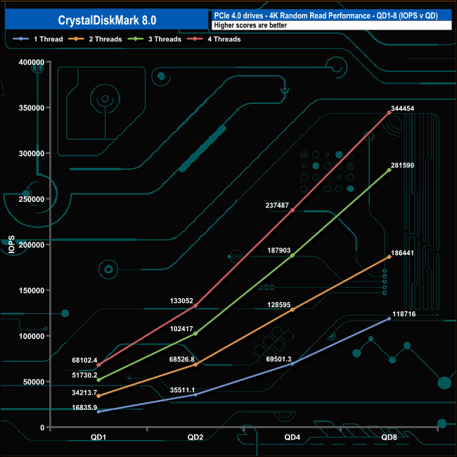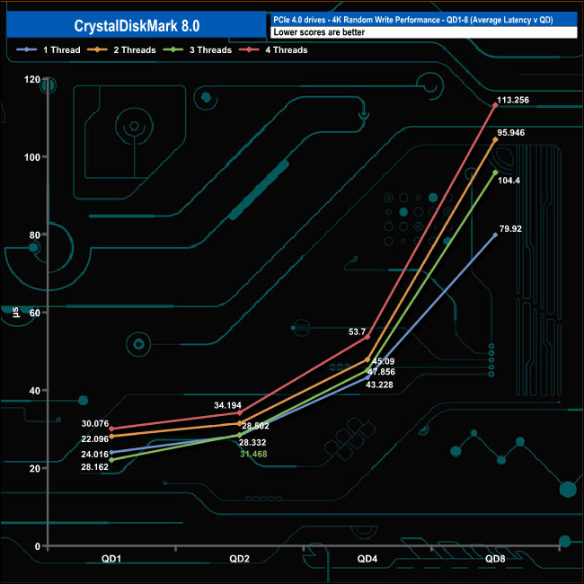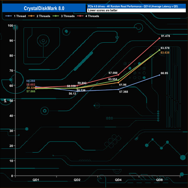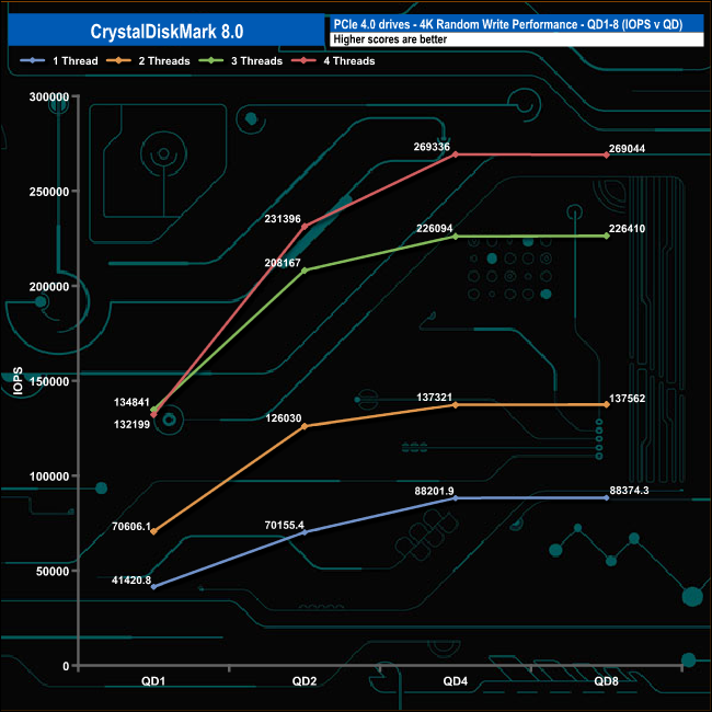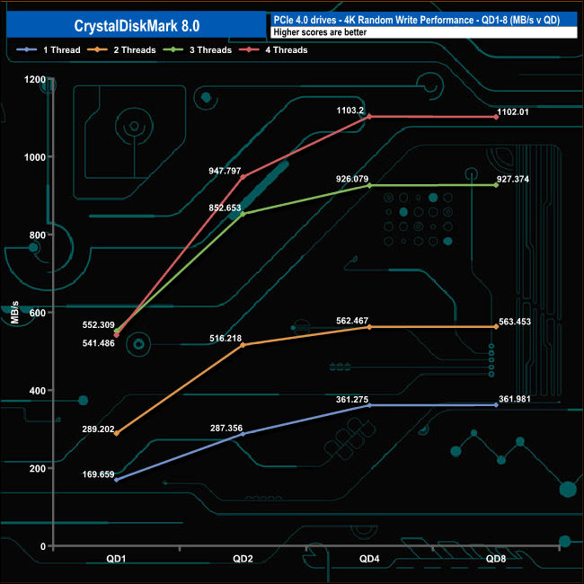 We used CrystalDiskMark 8 to test the random performance of the drive at lower queue depths (QD1 – QD8 where most of the everyday workloads occur) using 1 to 4 threads.