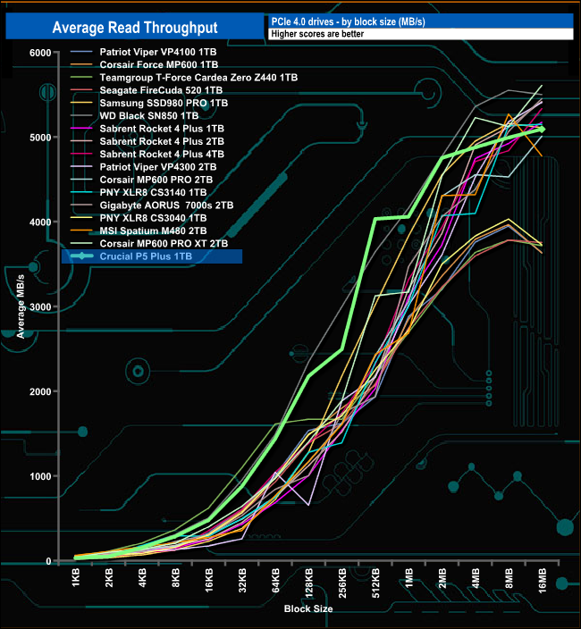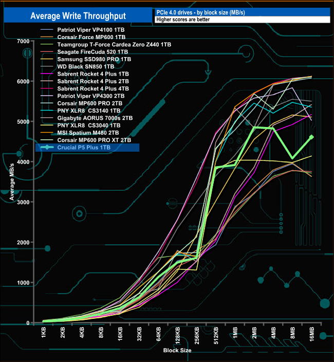 In the read throughput test, the Crucial P5 Plus peaks at the 16MB block mark at 5,091.43MB/s. That figure falls well short of the official maximum of 6,600MB/s.