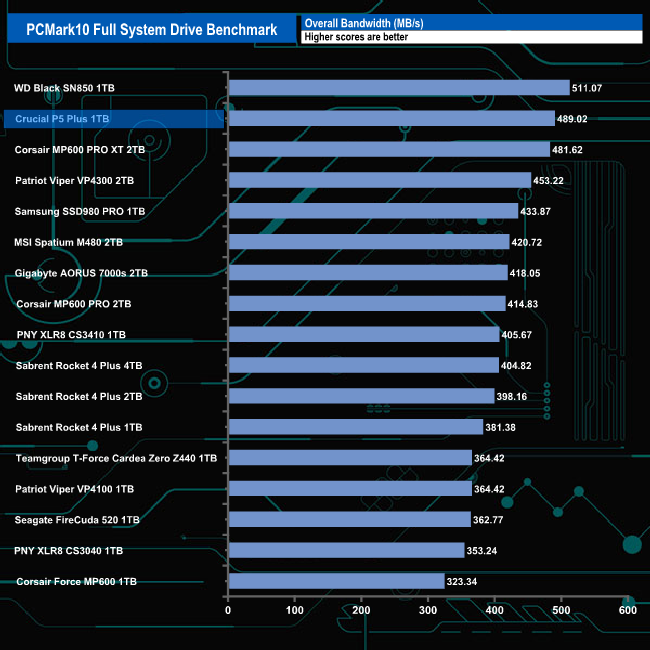 The overall bandwidth figure of 489.02MB/s that the Crucial P5 Plus scored is very good, good enough in fact, to see it go straight into second place on the results table behind the WD Black SN850.