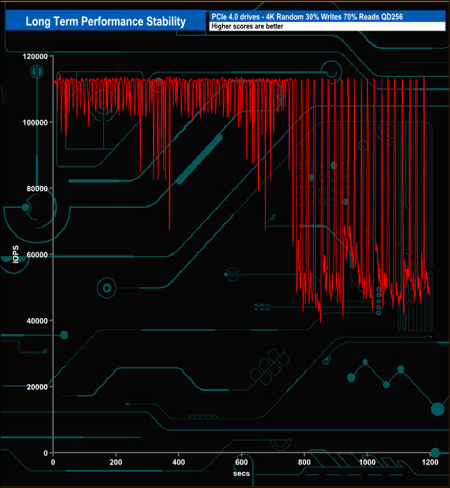 For the long term performance stability test, we set the drive up to run a 20-minute 4K random test with a 30% write, 70% read split, at a Queue Depth of 256 over the entire disk. The 1TB Crucial P5 Plus averaged 93,616 IOPS for the test with a good performance stability of 82%.