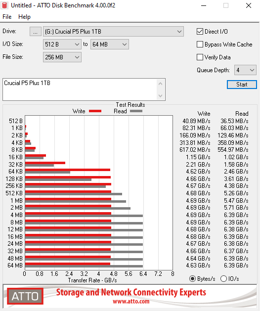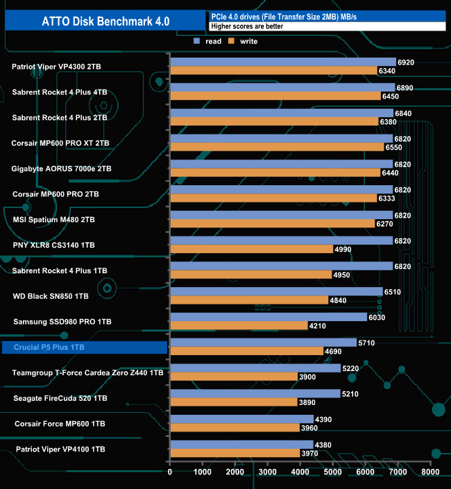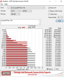 The official maximum Sequential read/write performance figures for the 1TB P5 Plus are up to 6,600MB/s and 5,000MB/s respectively. Using the ATTO benchmark we couldn’t quite hit either of these figures with reads of 5,710MB/s and 4,690MB/s for writes, figures which sees the drive in the bottom half of our results chart.