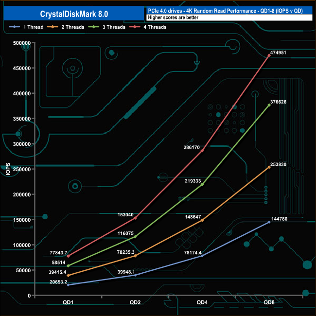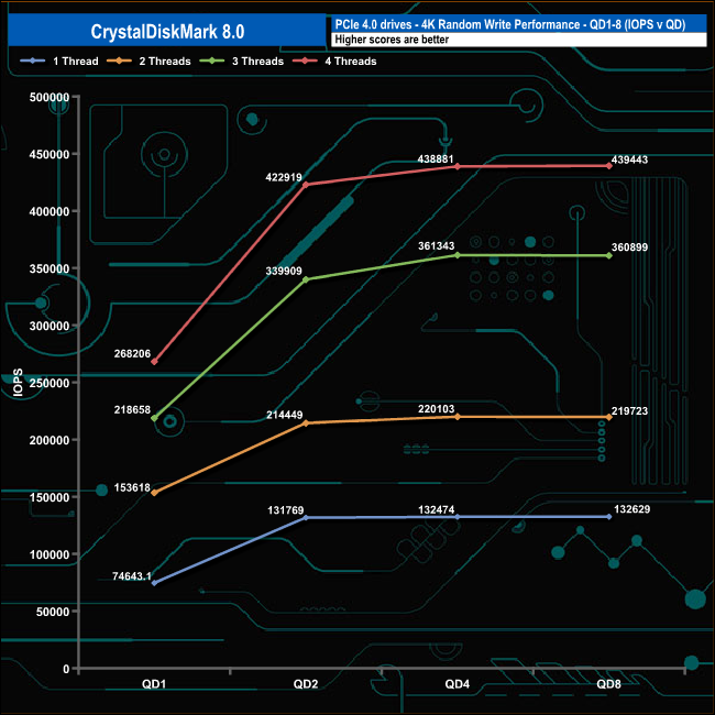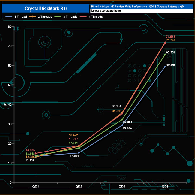 We used CrystalDiskMark 8 to test the random performance of the drive at lower queue depths (QD1 – QD8 where most of the everyday workloads occur) using 1 to 4 threads.