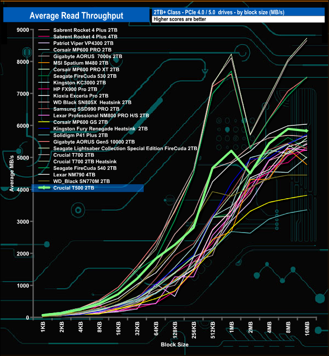 In our read-throughput test, the drive peaked at the 8MB block mark at 5,893.25MB/s before finishing the test run with a slightly slower 5,829.58MB/s. Both of these figures however are not close to the official maximum figure of 7,400MB/s.