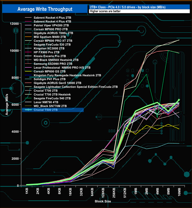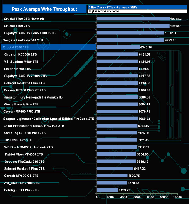 In the write throughput tests, the drive peaked at the end of the test run at 6,340.36MB/s. As with the read result, this is some way off the official maximum rating of 7.000MB/s.