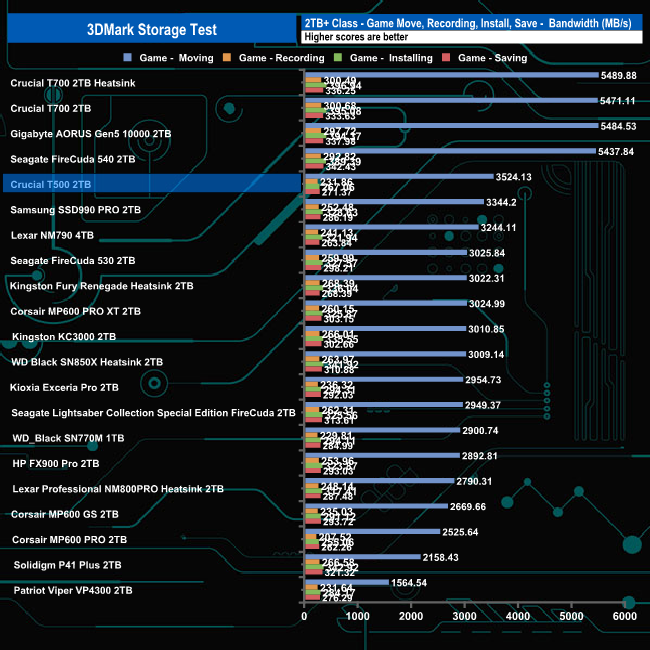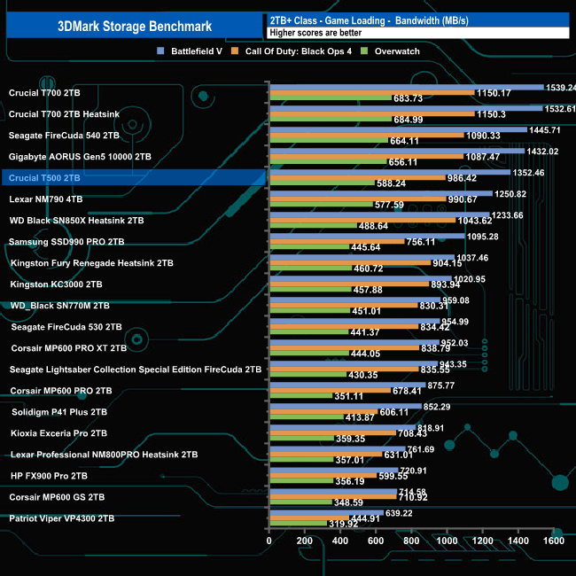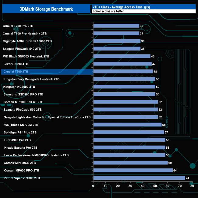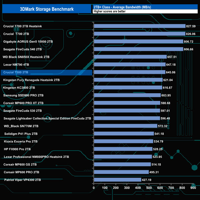 In 3DMark’s Storage Test, the 2TB T500 had an average game loading bandwidth figure for the three games of 975.71MB/s which is the fastest average for a Gen 4 drive with an average access time of 56µs.