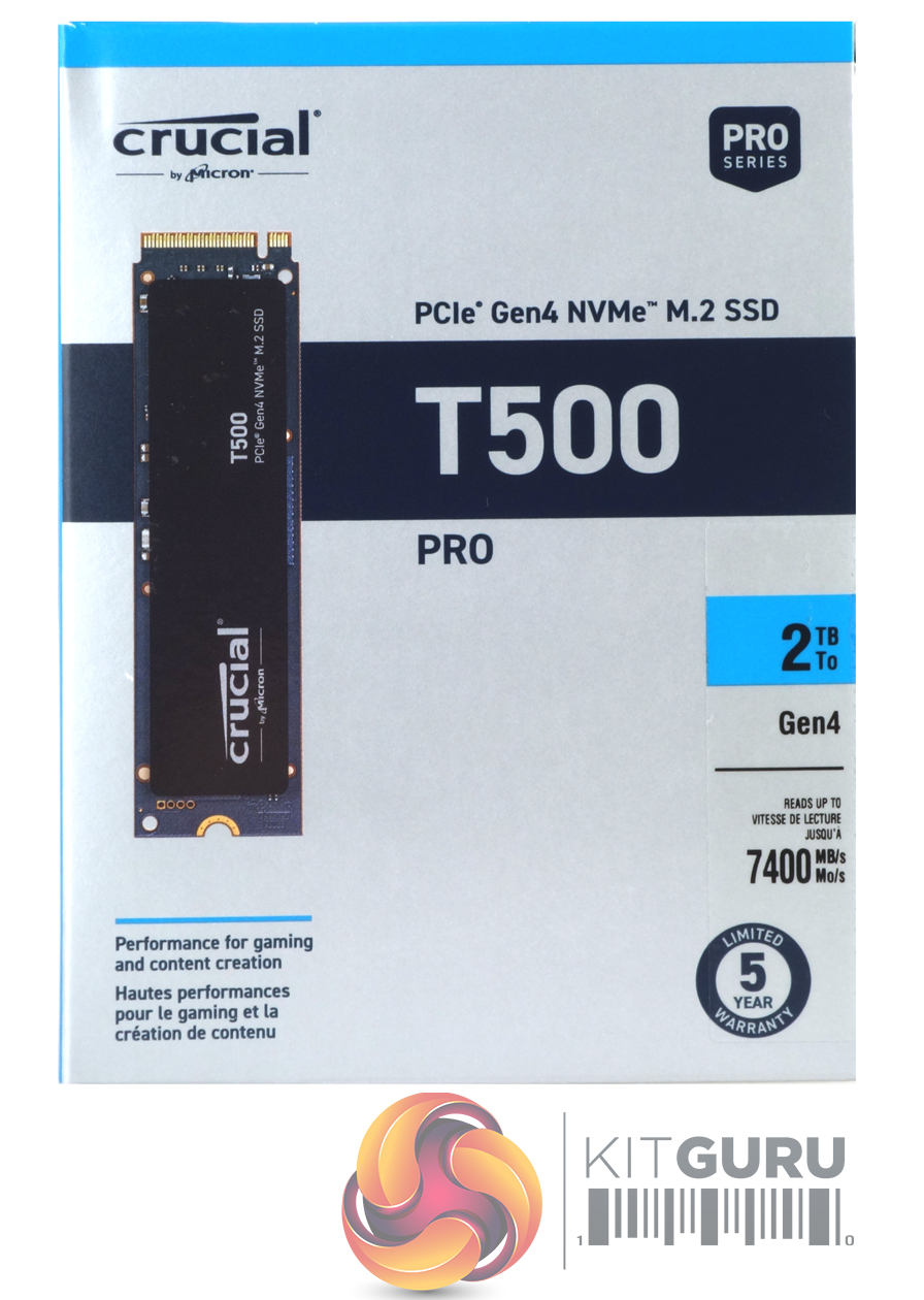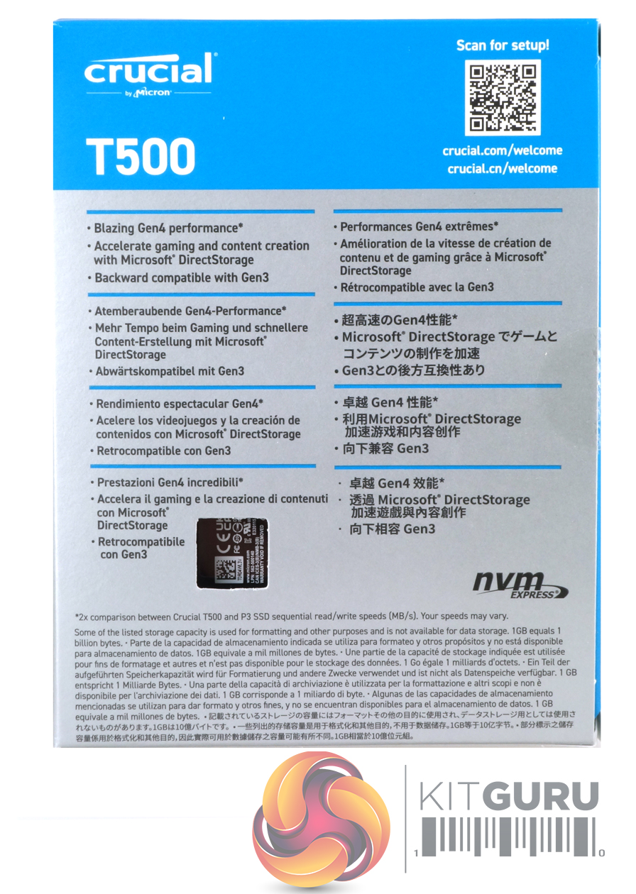 The T500 comes in a slim-line box with a good clear image of the drive on the front. To the right of this image is a longish sticker that displays the drive's capacity, maximum Sequential read speed (7,400MB/s) and a logo stating the 5-year warranty. The rear of the box is home to some multi-lingual notes about the drive's speed and backward compatibility.