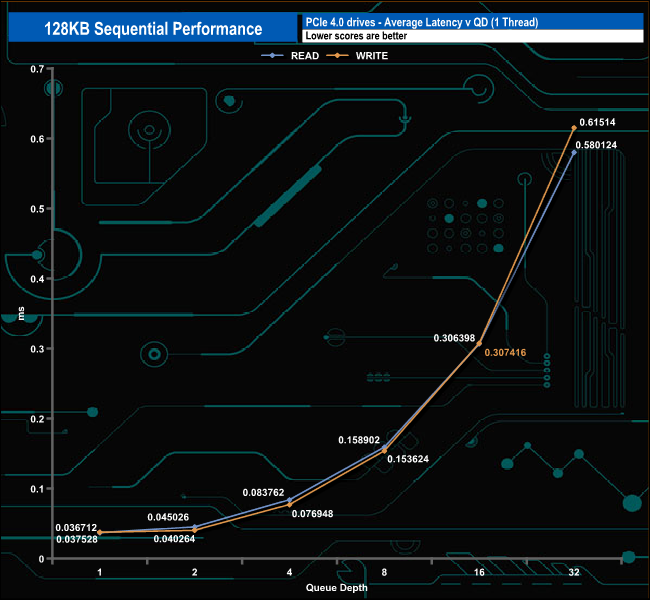 We used CrystalDiskMark 8‘s custom settings to test the Sequential read and write performance of the drive through a range of queue depths. The setup for the tests is listed below.