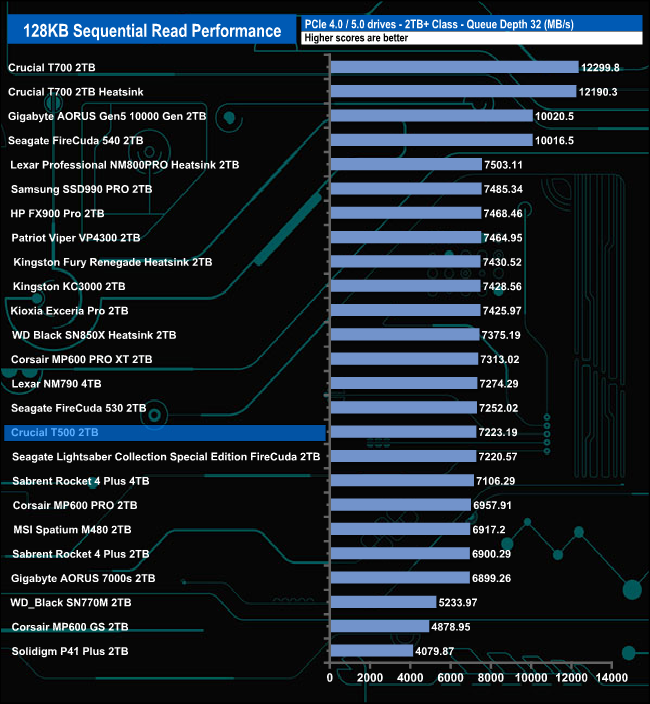At QDs 1 and 2, the T500 is the fastest Gen 4 drive we've seen to date. At QD 4 it slips behind WD's Black SN850X heatsink drive and at QD32 it lies in a low middle position in the results table.
