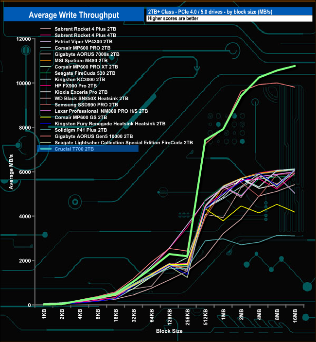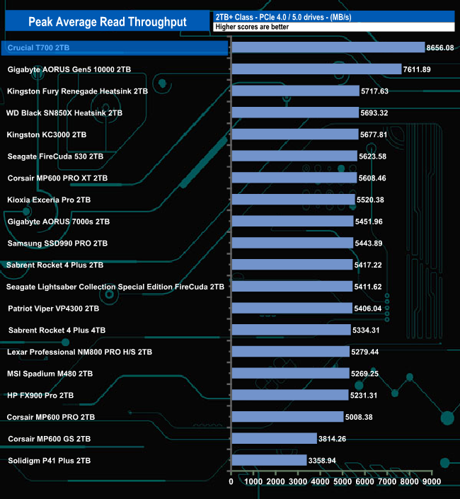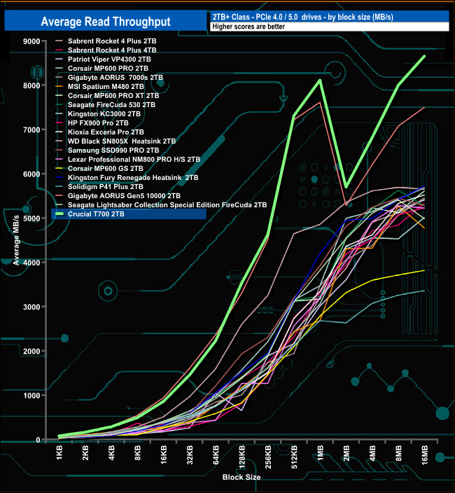 In our read-throughput tests, the Crucial T700 the performance climbed smoothly through the block marks until the 1MB mark where the performance drops off pretty considerably. After this drop the drive recovers well to finish the test runs at 8,656.08MB/s, some way off the official maximum of 12,400MB/s.