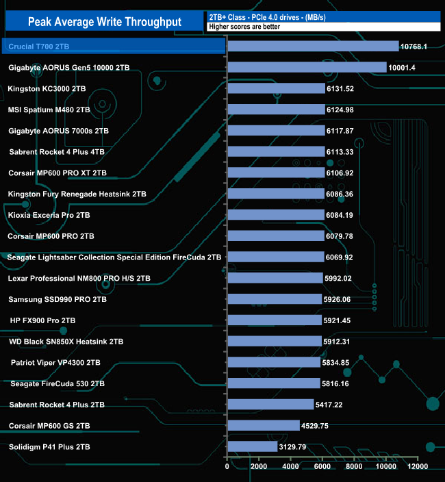 In the write-throughput test, the drive peaked at 10,768.1MB/s right at the end of the test run. That peak figure is 1,032MB/s off the official maximum.