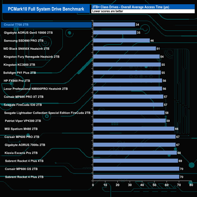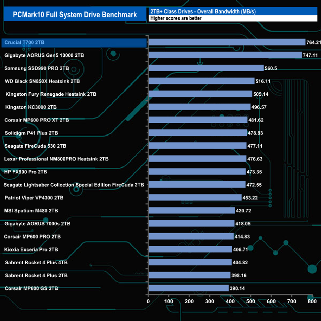 With an overall bandwidth figure of 764.21MB/s, the Crucial T700 sits in top spot on the results chart.