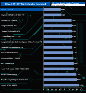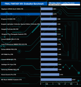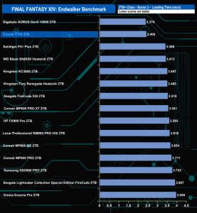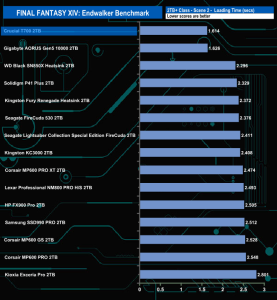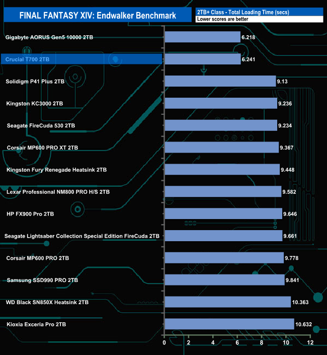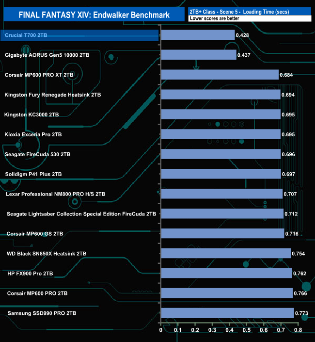 The Crucial T700 does very well in the Final Fantasy XIV Endwalker Official Benchmark topping three of the five scene load trace results. Overall though, it sits in second place behind Gigabyte's AORUS Gen5 10000 drive.