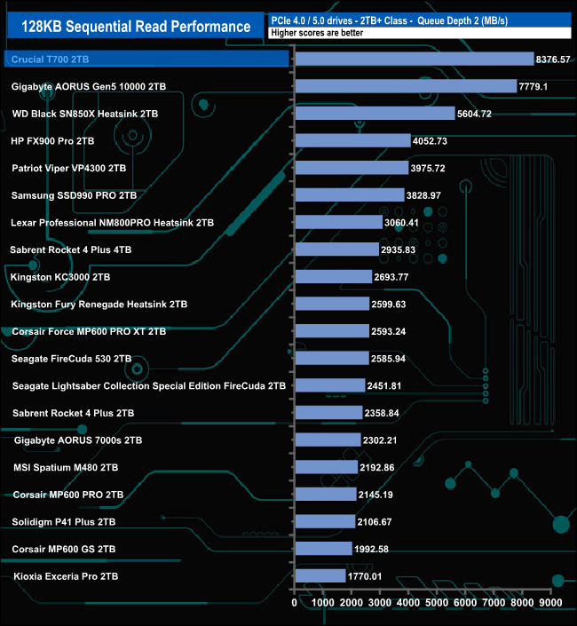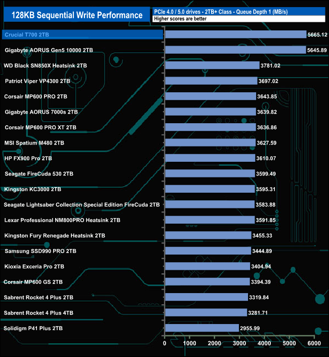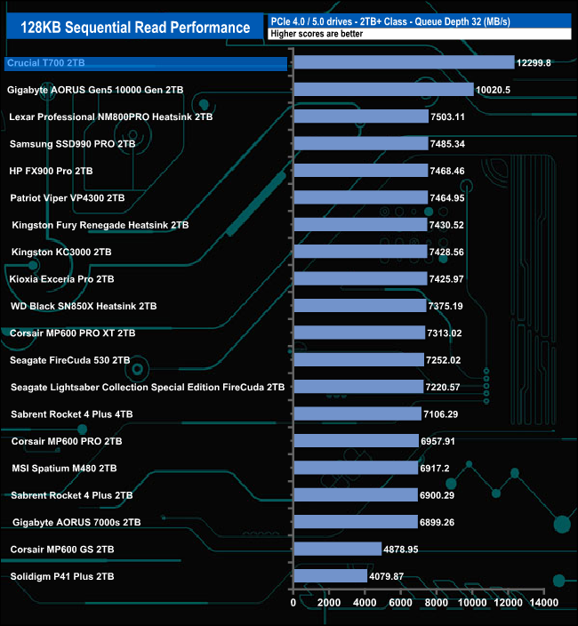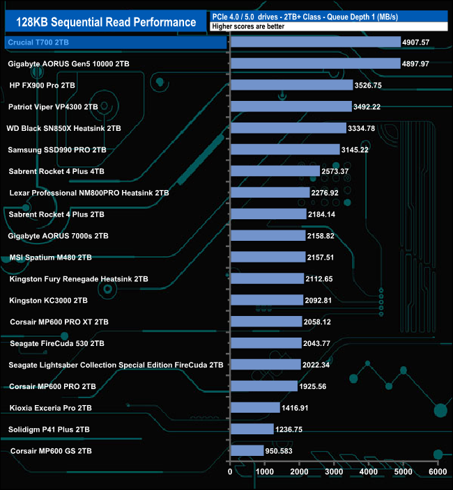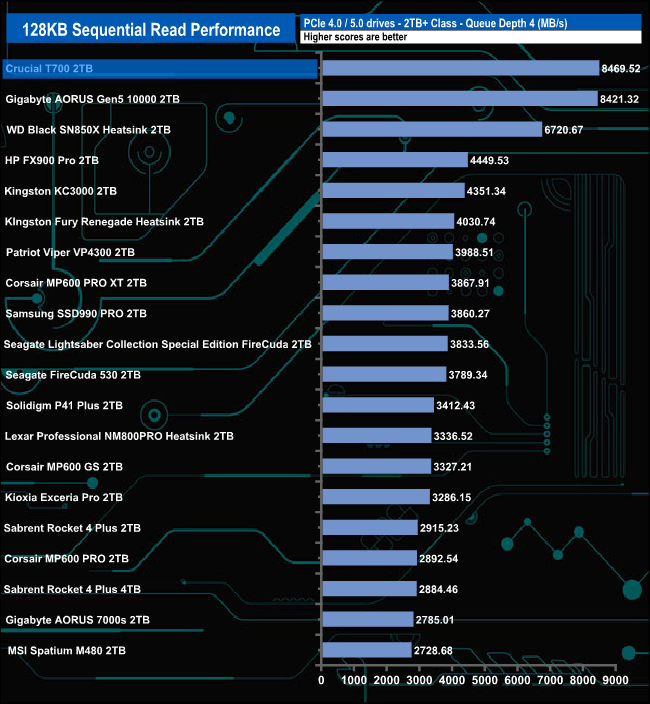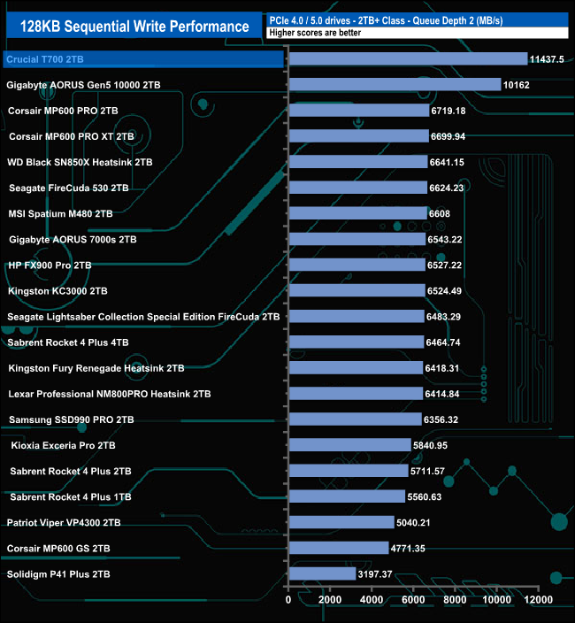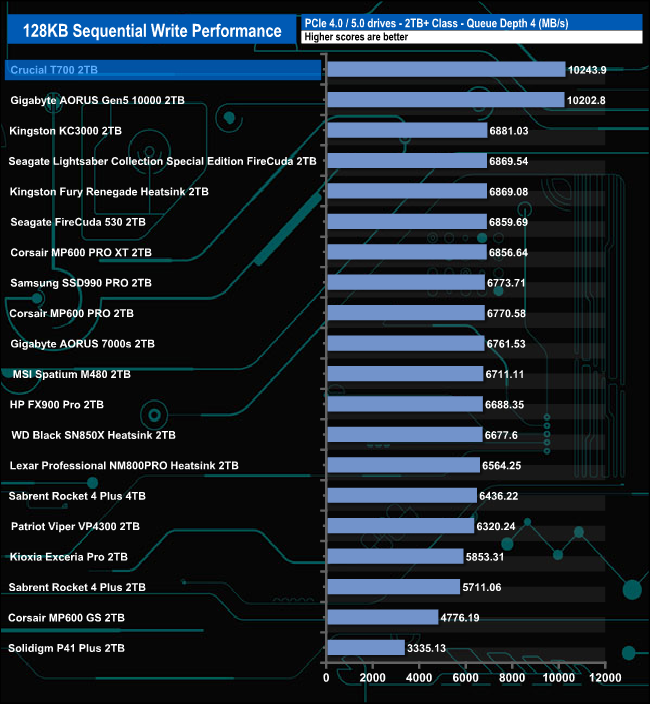 At QDs 1 and 4 the Crucial T700 and Gigabyte's AORUS Gen5 10000 are pretty much on the same pace. However, at QDs 2 and 32, the Crucial drive pulls away.