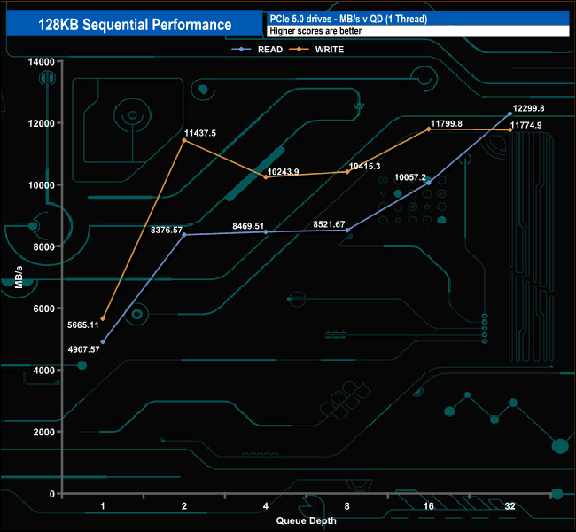 It's the same story when it comes to Sequential writes, with not much separating the two Gen 5 drives at QDs 1 and 4 with the Crucial drive pulling away in the other two tested queue depths.