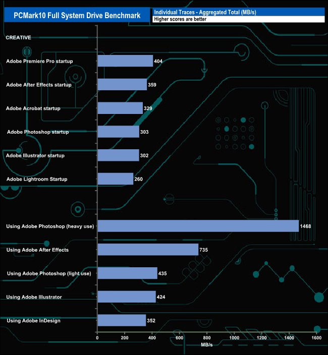 The PCMark 10 Full System Drive Benchmark uses a wide-ranging set of real-world traces from popular applications and common tasks to fully test the performance of the fastest modern drives. The benchmark is designed to measure the performance of fast system drives using the SATA bus at the low end and devices connected via PCI Express at the high end.