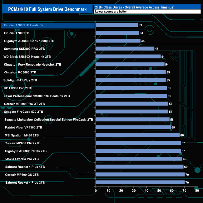 With an overall bandwidth figure of 766MB/s, the Crucial T700 Heatsink sits in top spot but only just on the results chart.