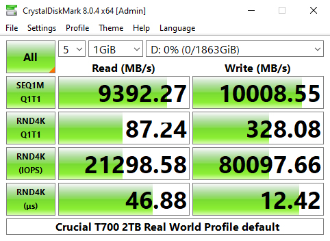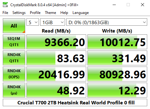 Crucial's T700 Heatsink sits just under the standard T700 in the Real World Profile chart with Sequential read/write scores of 9,392MB/s and 10,008MB/s.