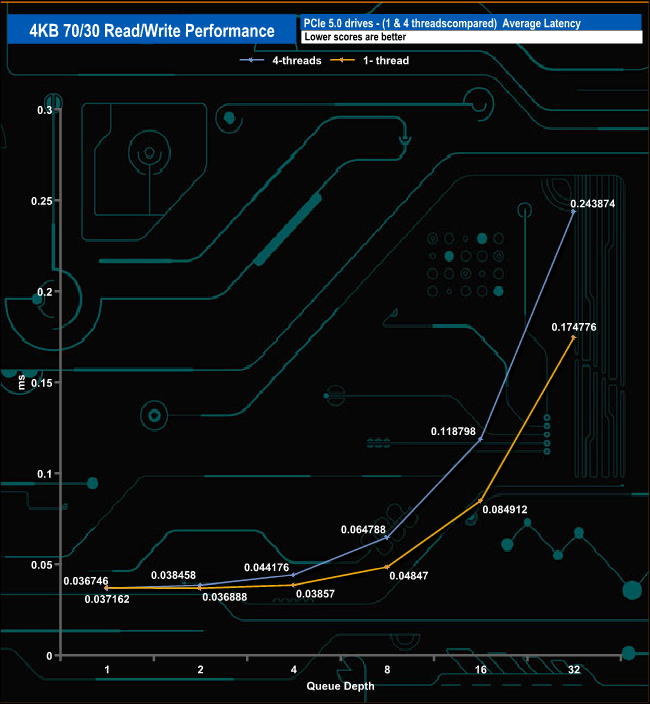 We used CrystalDiskMark 8’s custom settings to test the 4K 70/30 mixed read/write performance of the drive through a range of queue depths using a single thread and four threads.