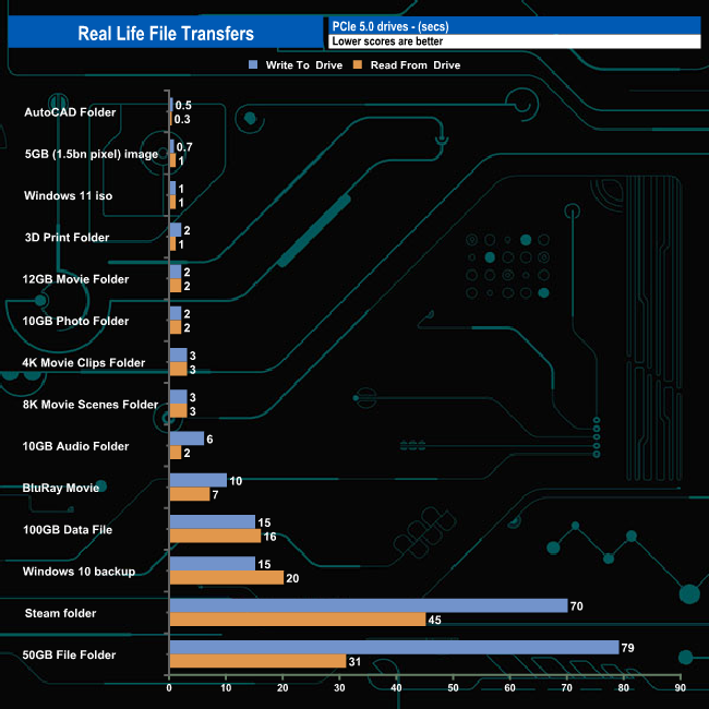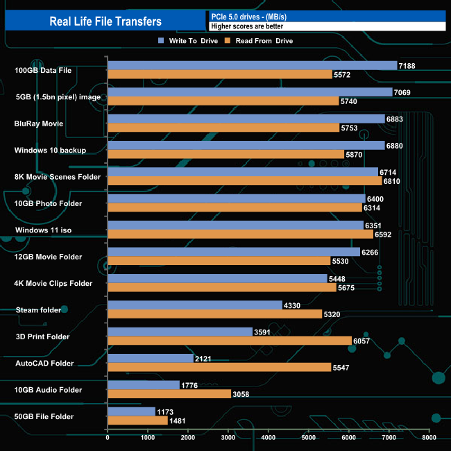 The T705 averaged 5,156MB/s when writing the 14 transfer tests, with the fastest being the 7,188MB/s for the 100GB Data file transfer and the slowest being the 50GB file folder transfer at 1,173MB/s. Reading back the data the average was 5,379MB/s. This time the fastest transfer was for the 8K Movie scenes folder at 6,810MB/s. Once again the slowest was the 50GB file folder at 1,481MB/s.