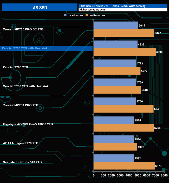 The AS SSD read score of 4936 sees the Crucial T705 with Heatsink in second place just above the T700 drive. That read figure may be the second fastest we've seen to date but the write score of 6996 is the fastest write score we've seen.