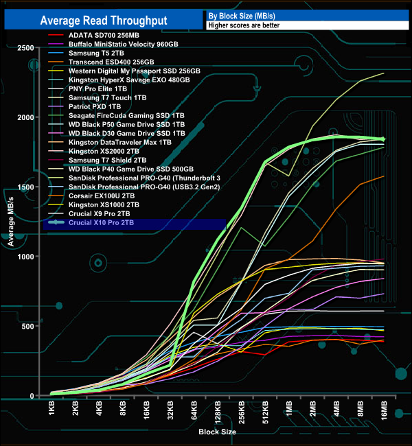 Crucial rates the X10 Pro at up to 2,100MB/s for Sequential reads and 2,000MB/s for writes. In our throughput tests, the drive didn't quite hit those official maximums with a peak read figure of 1,858MB/s (4MB) with writes peaking at 1,664.47MB/s (16MB). At the 2MB block mark the write performance of the drive drops sharply but it recovers quickly. Although the tested read/write figures are shy of the official ratings, the drive still offers strong performance.