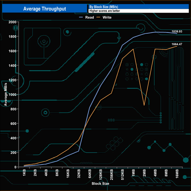 In the read-throughput test, the drive peaked at the 4MB Block at 1,858.33MB/s before dropping back slightly to finish the test run at 1,839.93MB/s.