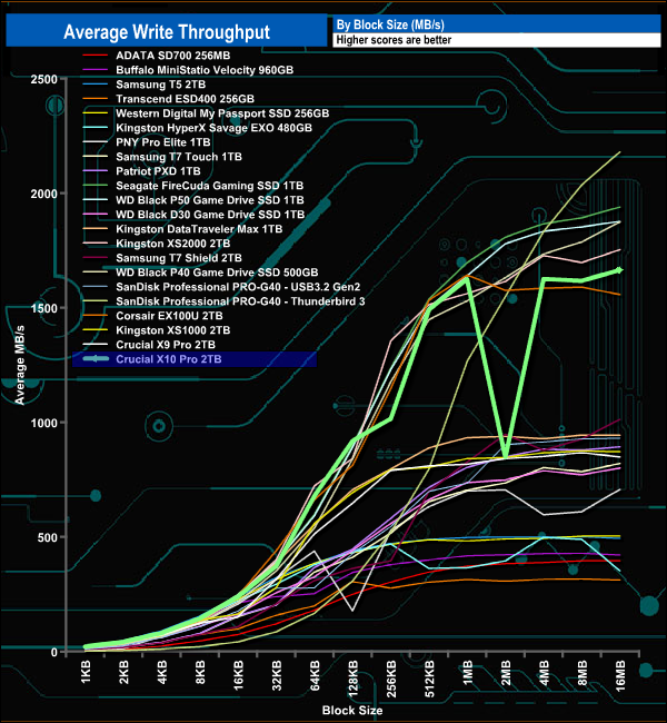 In the write throughput test, the performance of the Crucial X10 Pro climbed quite steadily up to the 2MB block, where the performance dropped off quite dramatically before recovering quickly, finishing the test run at 1,664MB/s.
