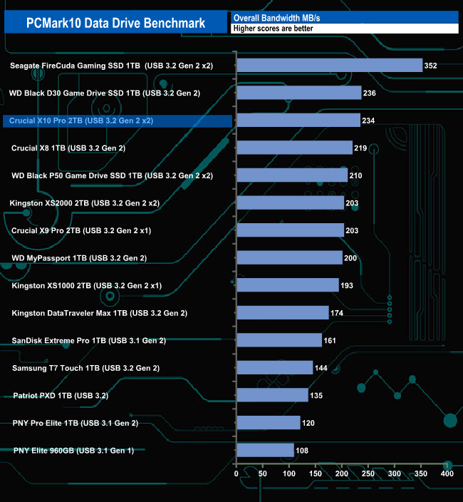 The Crucial X10 Pro does pretty well in PCMark 10 Data Drive Benchmark. It sits in the top 10 drives for all three parts of the benchmark run (Read-Write, Read and Write traces) with the Write test appearing to be the weakest of the three. Its overall bandwidth figure of 234MB/s is good enough to see the drive sit in third place on our results chart.