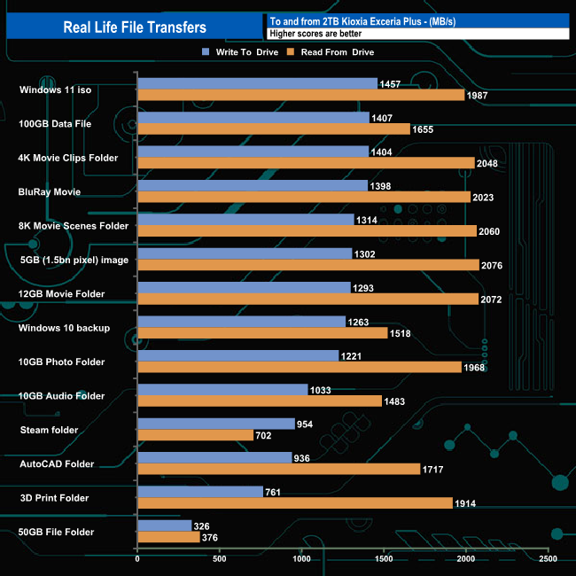 Crucial's X10 Pro averaged 1,147.78MB/s for the 14 file transfers in write mode, the fastest being the 1,457MB/s for the Windows 11 iso transfer. When it came to reads the drive averaged 1,685.64MB/s with the fastest being the 2,072MB/s for the 5GB image transfer. The drive topped the 2GB/s mark in five out of the fourteen read transfers and passed the 1GB/s mark in another seven.