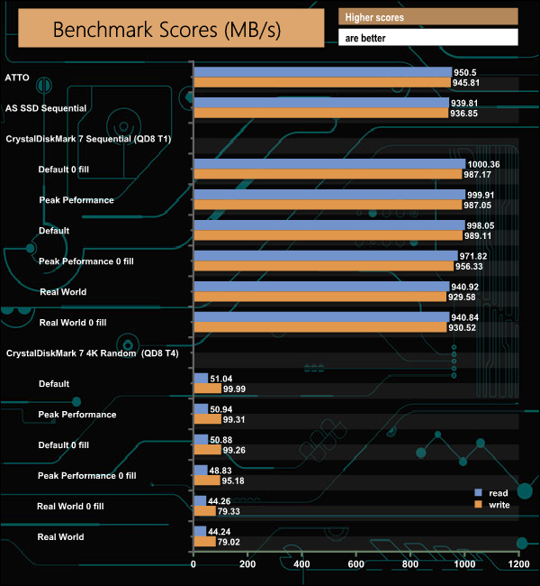 Crucial's official Sequential read figure for the drive is up to 1,050MB/s. With the ATTO benchmark, we couldn't quite get to the official read maximum, with the review sample topping out at 950MB/s, with writes reaching 945MB/s. All the other Sequential tests we tried, namely AS SSD and CrystalDiskMark, ended up shy of the official maximum, but the closest we saw was when the drive was tested with compressible data in Crystal Disk Mark, where the X8 produced a read figure of 1000MB/s.