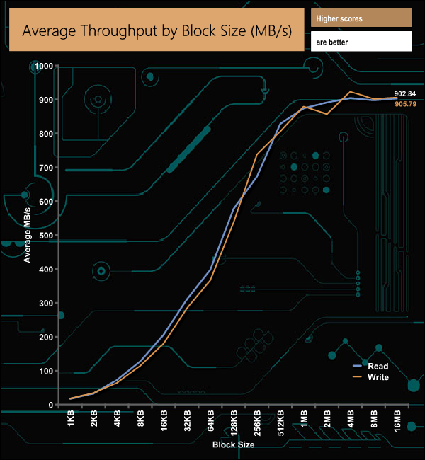 In our throughput tests, we couldn't hit the official maximum read speed of 1,050MB/s, but the peak read/write results of 904.03MB/s and 922.92MB/s (both at the 4MB block mark) respectively are nevertheless very impressive for an external drive.