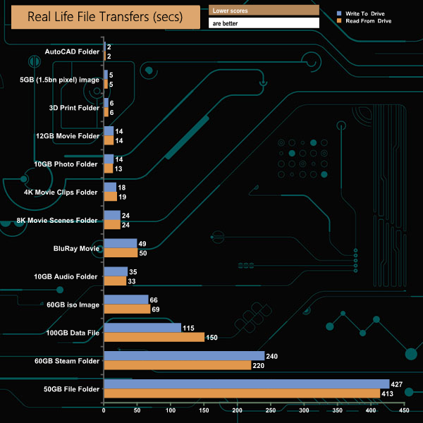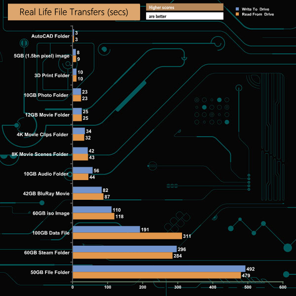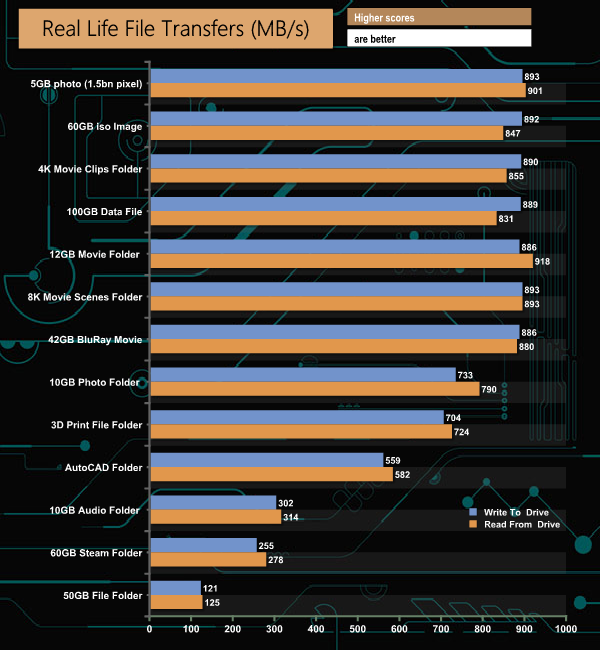 To get a measure of how much faster the X8 can transfer files, we took the SATA SSD out of the equation and used the same files but transferred to and from a 512GB Toshiba OCZ RD400 NVMe drive.