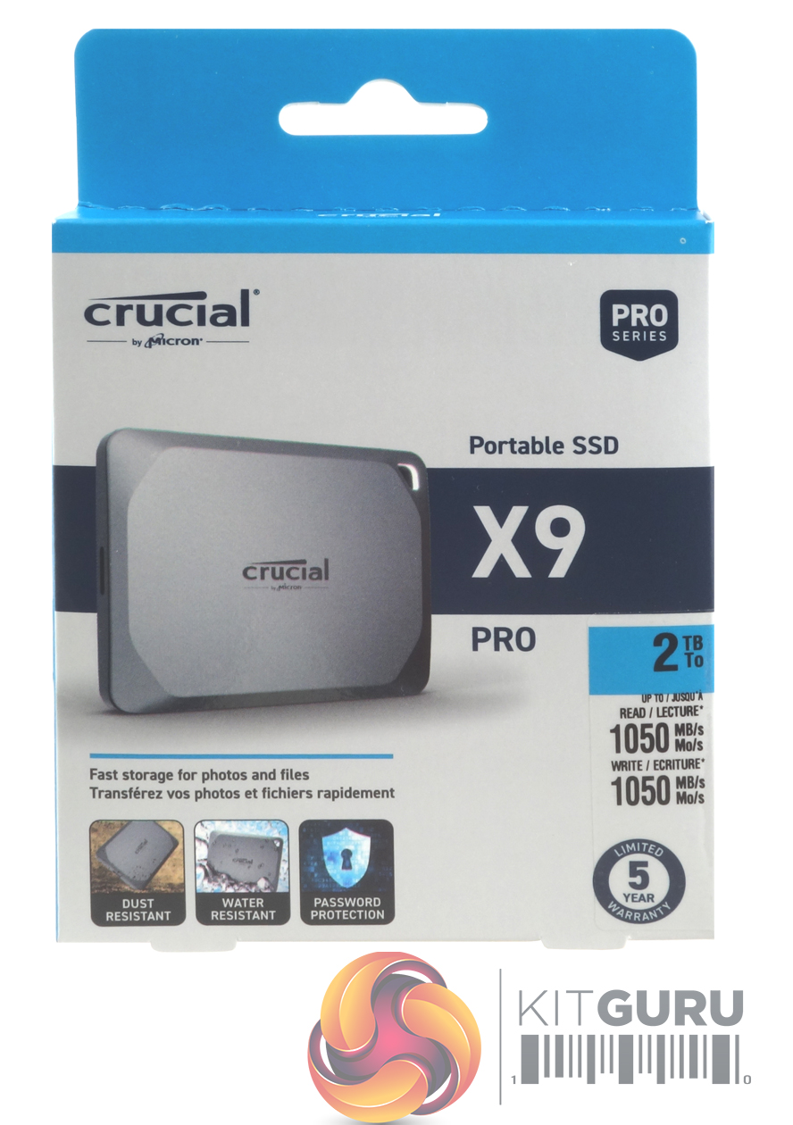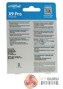 The Crucial X9 Pro comes in a compact box with an image of the drive on the front, which isn't life size but not too far off it. To the right of the image is a sticker that displays the drive's capacity, under which are displayed the read and write ratings in English and French. Under the drive image are two small images stating that the drive is dust and water-resistant. Next to these is an icon representing the fact the drive supports password protection.