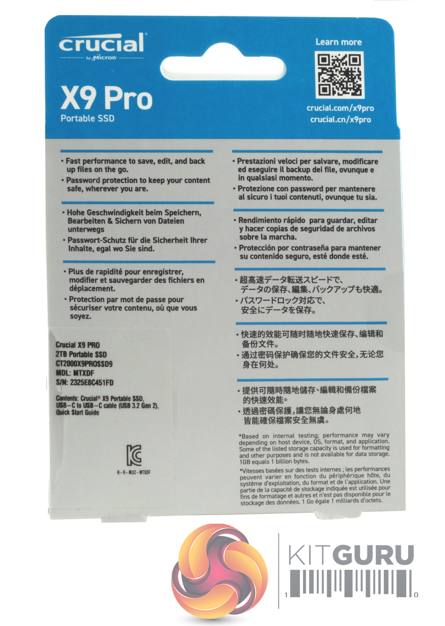 The back of the box has some multi-lingual drive information and a list of what's in the box. At the top, there is a QR code to use if you want more information about the X9 Pro.