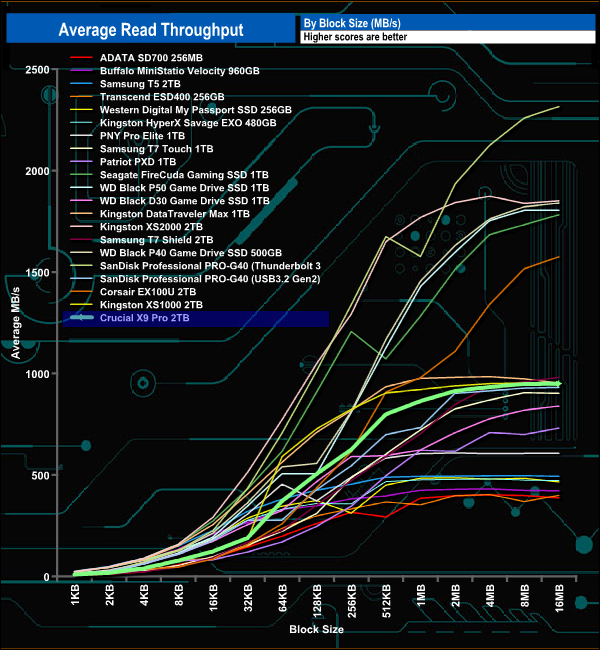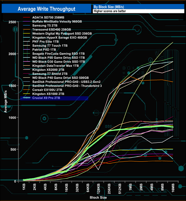 Crucial rates the X9 Pro at up to 1,050MB/s for both Sequential reads and writes. In our throughput tests, the drive didn't quite hit those official maximums with a peak read figure of 950MB/s (16MB) with writes peaking at 867MB/s (8MB). Although the tested read/write figures are shy of the official ratings, the drive still offers strong performance.