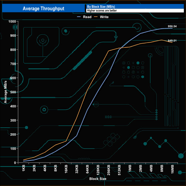 In the read throughput test, the drive peaked at the at end of the test run (16MB Block) at 950.54MB/s.