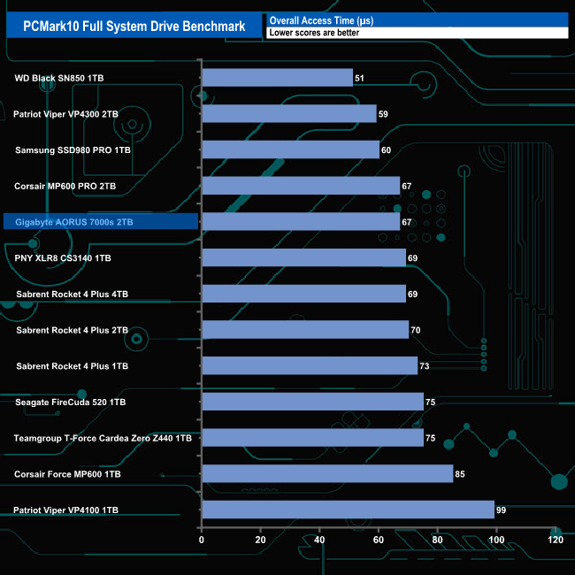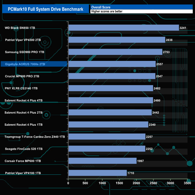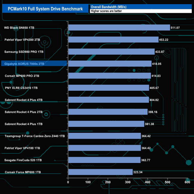 Overall the Aorus 7000s performs well in PCMark10’s Full System Drive benchmark with an overall bandwidth score of 418.05MB/s, the fastest we've seen to date for a drive using Phison's E18 second-generation controller.
