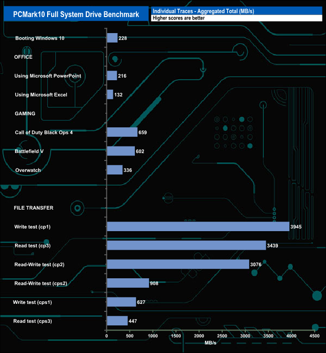 The PCMark 10 Full System Drive Benchmark uses a wide-ranging set of real-world traces from popular applications and common tasks to fully test the performance of the fastest modern drives. The benchmark is designed to measure the performance of fast system drives using the SATA bus at the low end and devices connected via PCI Express at the high end.